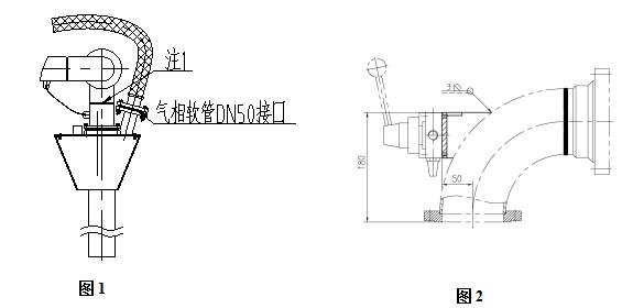 密封裝置氣相法蘭與氣相軟管接口相連,我司密封裝置上提供HG/T20592 DN80 PN16 RF法蘭,與之連接的墊片、連接螺栓、軟管、變徑接頭(原鶴管氣相為DN50)、壓力表部分由買方自行匹配,賣方提供在鶴管上固定軟管管夾,軟管規(guī)格為DN80復合軟管。
